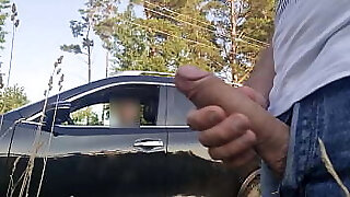 I pull out my trouser snake on a beach field. This young woman who drives from this beach, looks overwhelmed by what she watches !! She want look how i cum