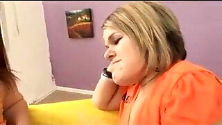 Hot, curvy ebony honey takes two hard white cocks on the sofa