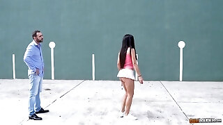 Hitting tennis player with big tits agrees to tough pounding at the field