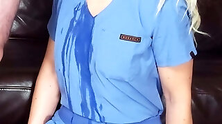 Sloppy nurse Bj soaks thru the scrubs