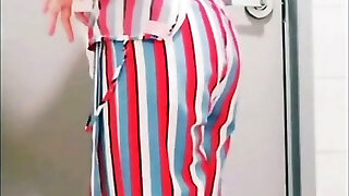 Amazing light haired assistant pulls down g-strings and exposes big booty